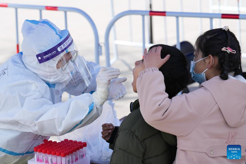 A medical worker collects nucleic acid sample from a kid at a testing site in Dongcheng District, Beijing, capital of China, March 21, 2022. (Xinhua/Ju Huanzong)