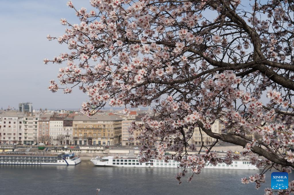 Blooming almond tree with the view of downtown of the city in the background is seen from a hill in Budapest, Hungary on March 20, 2022. (Photo by Attila Volgyi/Xinhua)