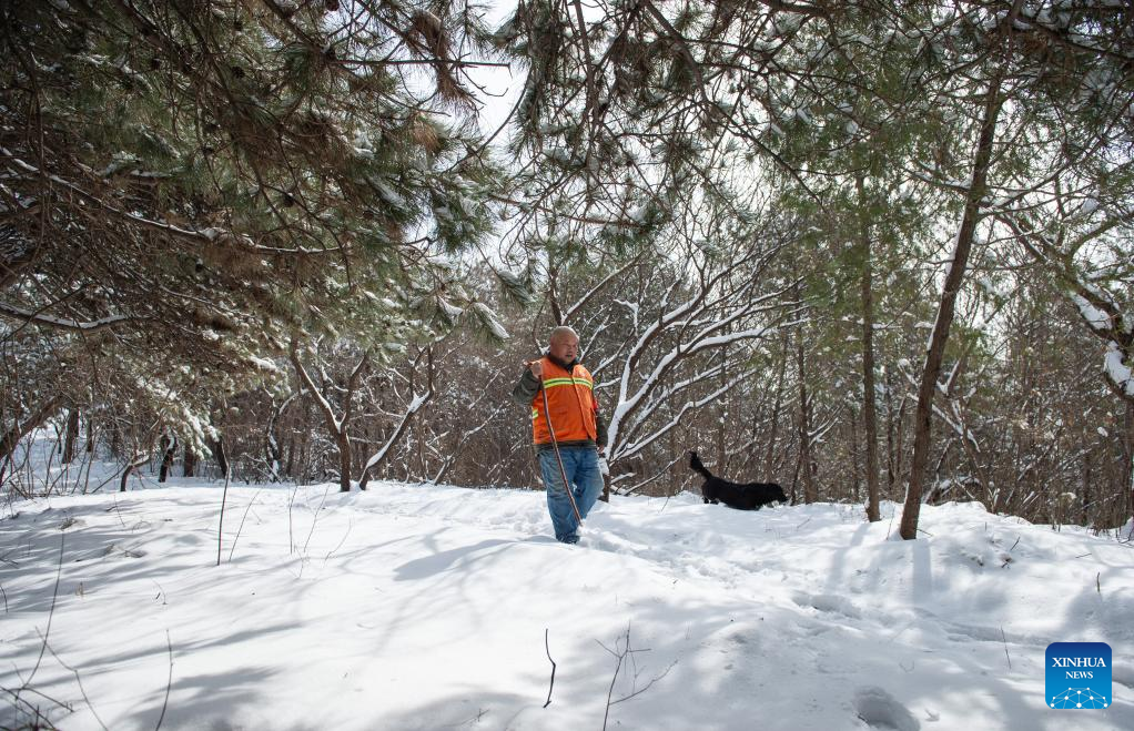 Song Bao patrols the forest on Mangshan Mountain in Beijing, capital of China, March 19, 2022.