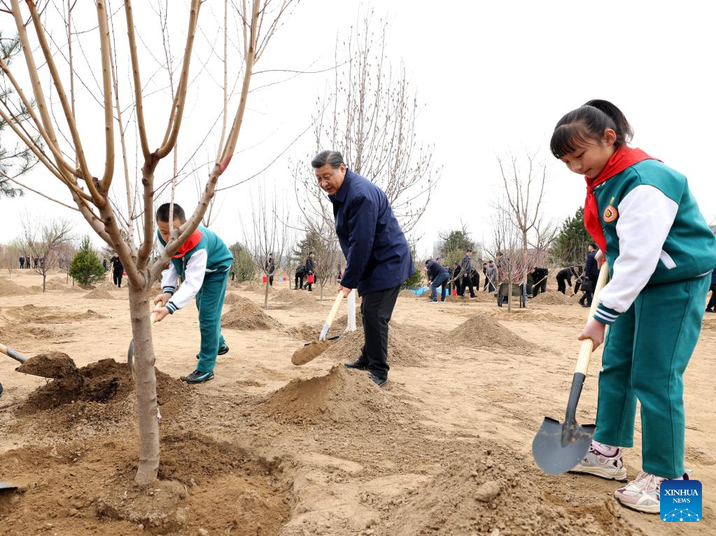 BEIJING, March 30 (Xinhua) -- Participating in Beijing's tree planting activity on March 30, Xi Jinping, General Secretary of the Communist Party of China (CPC) Central Committee, President of the People's Republic of China and Chairman of the Central Military Commission, said that he had participated in such activities for 10 consecutive years. "I want to do my bit for the Beautiful China initiative, and also to sow the seeds of ecological conservation in the entire society, among the Chinese youth in particular," he stressed. Xi said that he intends to call on all Chinese people to act as participators and promoters in the endeavor for ecological conservation. "With perseverance and accumulated efforts, we will be able to make our country's sky bluer, mountains lusher, waters clearer and the environment more beautiful," he said.