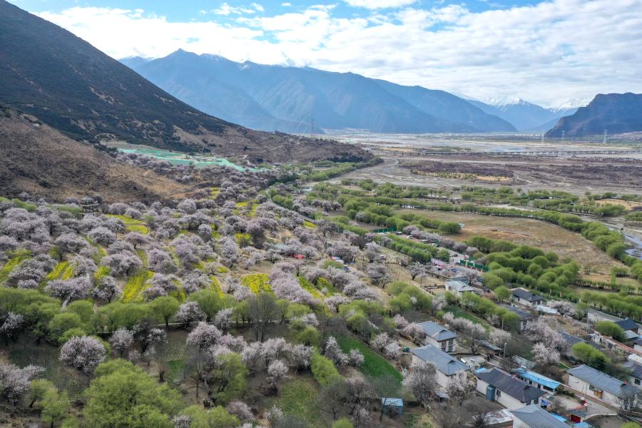 Drone photo shows picturesque view of peach blossoms in Nyingchi, southwest China's Tibet Autonomous Region, March 30, 2022. (Photo/China News Service)