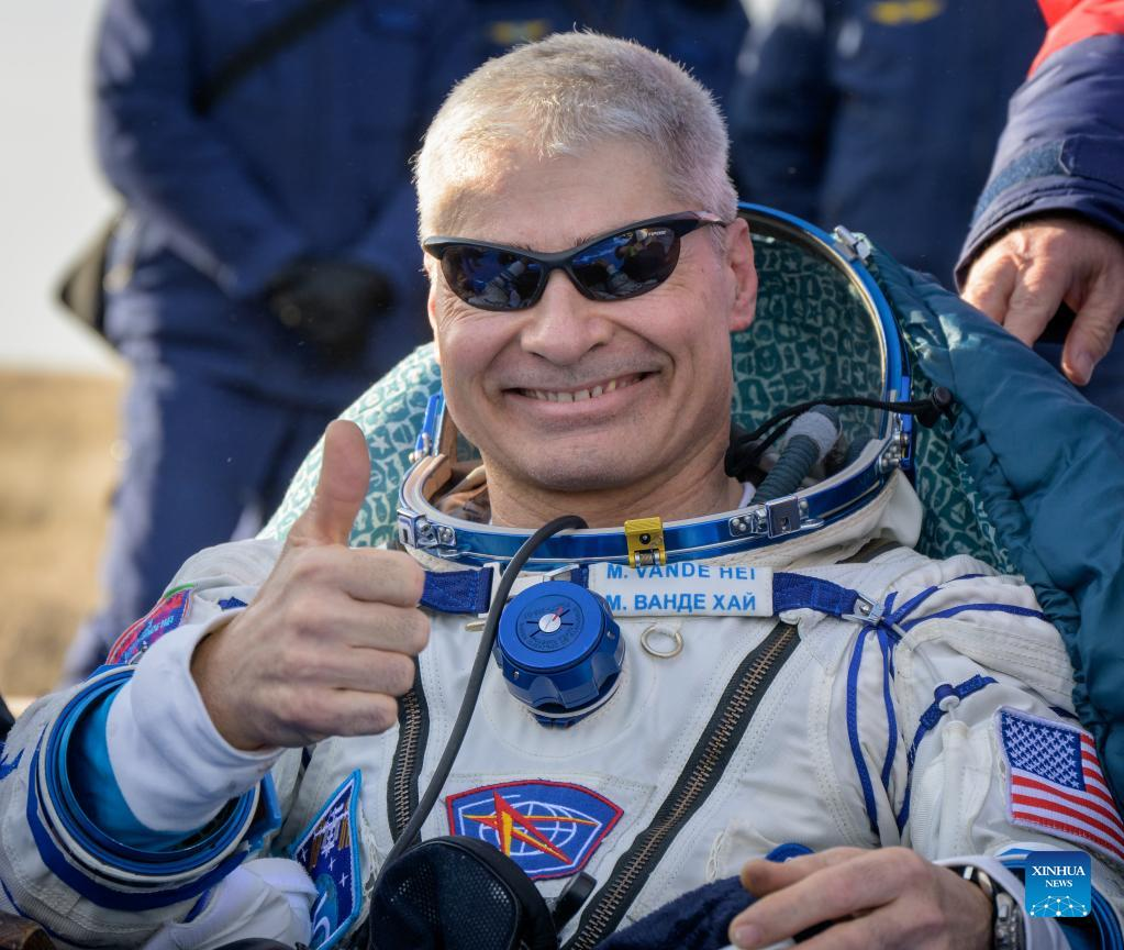NASA astronaut Mark Vande Hei gestures outside the Soyuz MS-19 manned spacecraft after landing in an area southeast of the town of Dzhezkazgan, Kazakhstan, March 30, 2022. After extending the record for the longest single spaceflight in history by an American to 355 days, NASA astronaut Mark Vande Hei returned to Earth on Wednesday with two Russian crewmates. Vande Hei departed the International Space Station along with Russian cosmonauts Anton Shkaplerov and Pyotr Dubrov at 3:21 a.m. Eastern Day Time (EDT), and made a safe, parachute-assisted landing at 7:28 a.m. EDT southeast of the remote town of Dzhezkazgan, Kazakhstan, according to NASA. (NASA/Bill Ingalls/Handout via Xinhua)