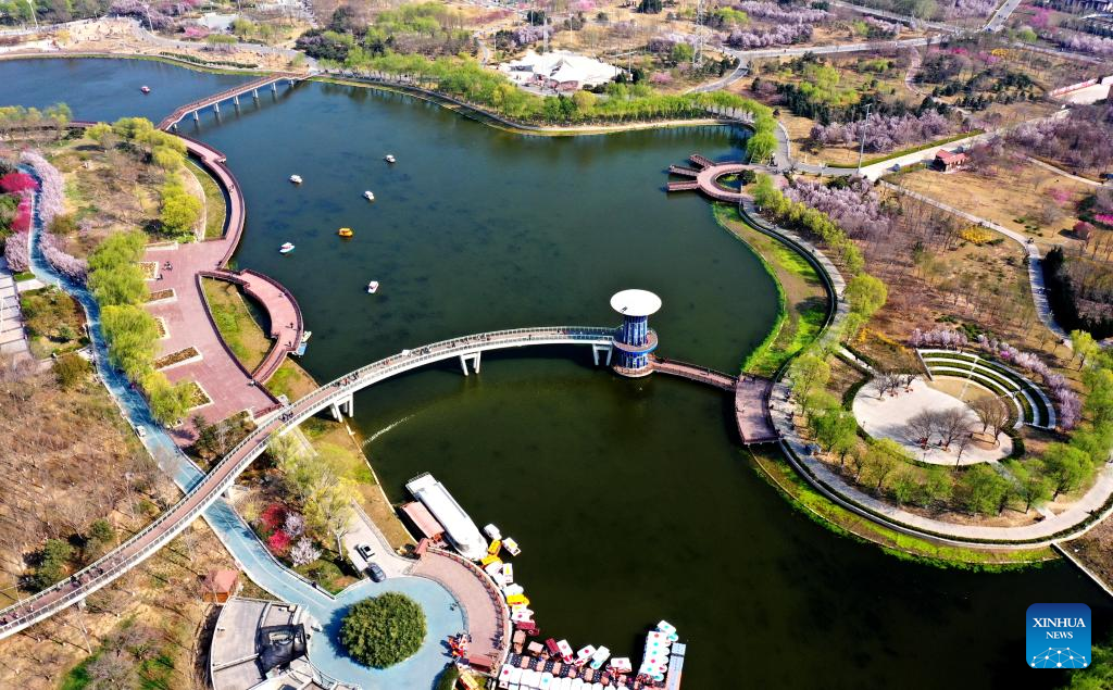 Aerial photo taken on April 3, 2022 shows a view of a water park in Luancheng District of Shijiazhuang, north China's Hebei Province. (Photo by Li Mingfa/Xinhua)
