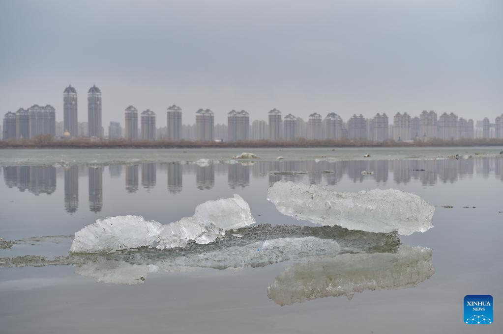 Photo taken on April 8, 2022 shows ice chunks on the Songhua River in Harbin, northeast China's Heilongjiang Province. Ice flow occurred on Thursday in the Harbin section of Songhua River, according to Heilongjiang Province Hydrology and Water Resources Center. The date was one day earlier than in previous years. The water level stood at 116.29 meters and the amount of water flowing per second reached 1,100 cubic meters. (Xinhua/Xie Jianfei)