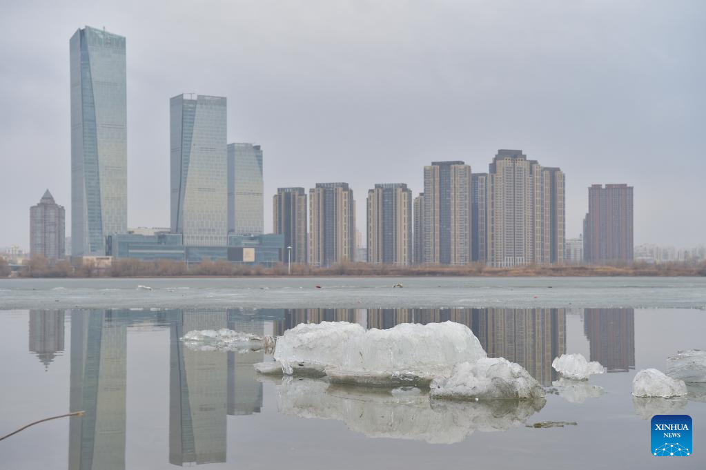 Aerial photo taken on April 8, 2022 shows the Songhua River in Harbin, northeast China's Heilongjiang Province. Ice flow occurred on Thursday in the Harbin section of Songhua River, according to Heilongjiang Province Hydrology and Water Resources Center. The date was one day earlier than in previous years. The water level stood at 116.29 meters and the amount of water flowing per second reached 1,100 cubic meters. (Xinhua/Xie Jianfei)