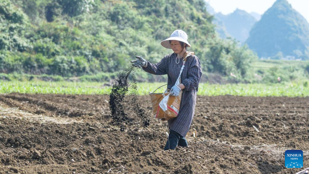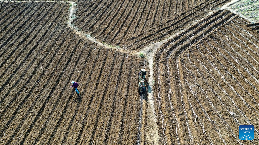 Aerial photo shows farmers working in the sugar cane fields in Dahua Township of Dahua Yao Autonomous County, south China's Guangxi Zhuang Autonomous Region, April 8, 2022. (Xinhua/Zhang Ailin)