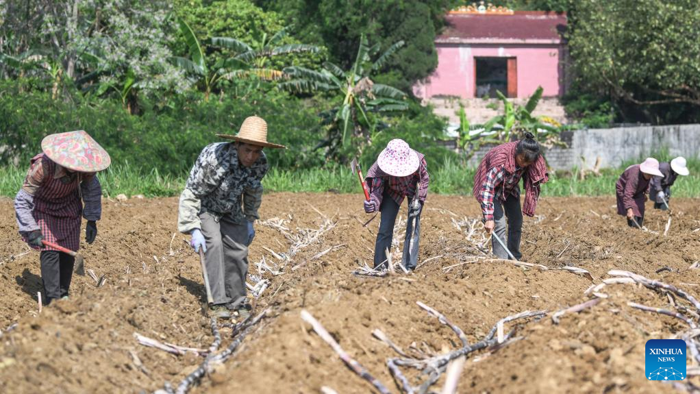 Farmers work in the sugar cane fields in Liangshan Village of Dahua Yao Autonomous County, south China's Guangxi Zhuang Autonomous Region, April 9, 2022. (Xinhua/Zhang Ailin)