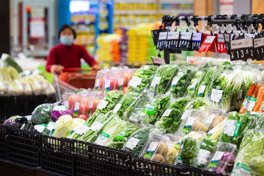 A customer selects goods at a market in Nanjing, east China's Jiangsu Province, Jan. 12, 2022. (Photo by Su Yang/Xinhua)