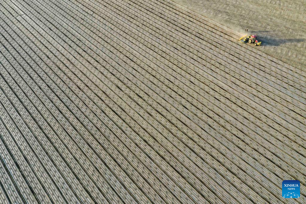 Aerial photo taken on April 18, 2022 shows a farming machine working in a cotton field in Shawan City, northwest China's Xinjiang Uygur Autonomous Region.