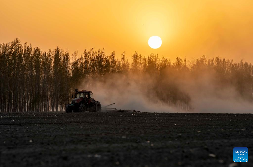 A farming machine works in a cotton field in Shawan City, northwest China's Xinjiang Uygur Autonomous Region, April 17, 2022.