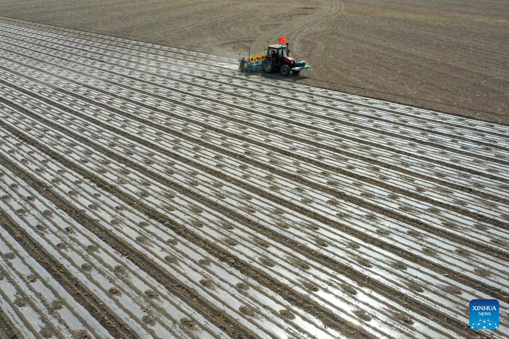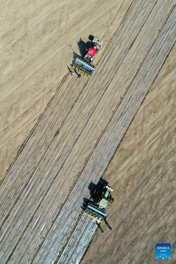 Aerial photo taken on April 19, 2022 shows a seeding machine guided by the BeiDou Navigation Satellite System working in a cotton field in a farm of a division of Xinjiang Production and Construction Corps in northwest China's Xinjiang Uygur Autonomous Region.