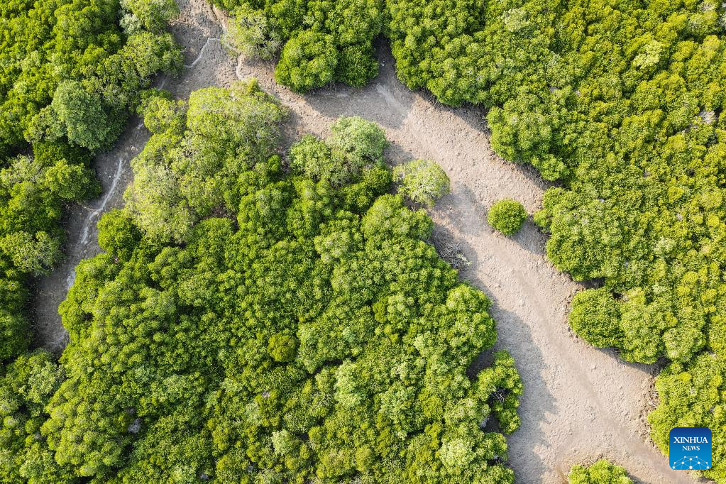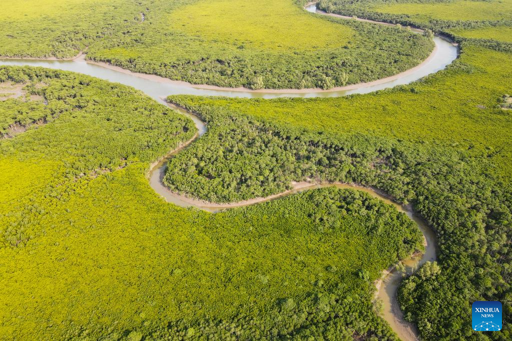Aerial photo taken on April 27, 2022 shows Dongzhaigang National Nature Reserve, south China's Hainan Province. Dongzhaigang National Nature Reserve, the first wetland nature reserve dominating mangrove forest in China, started to conduct bird diversity monitoring in order to learn the changes and rules of bird population here. (Xinhua/Zhang Liyun)