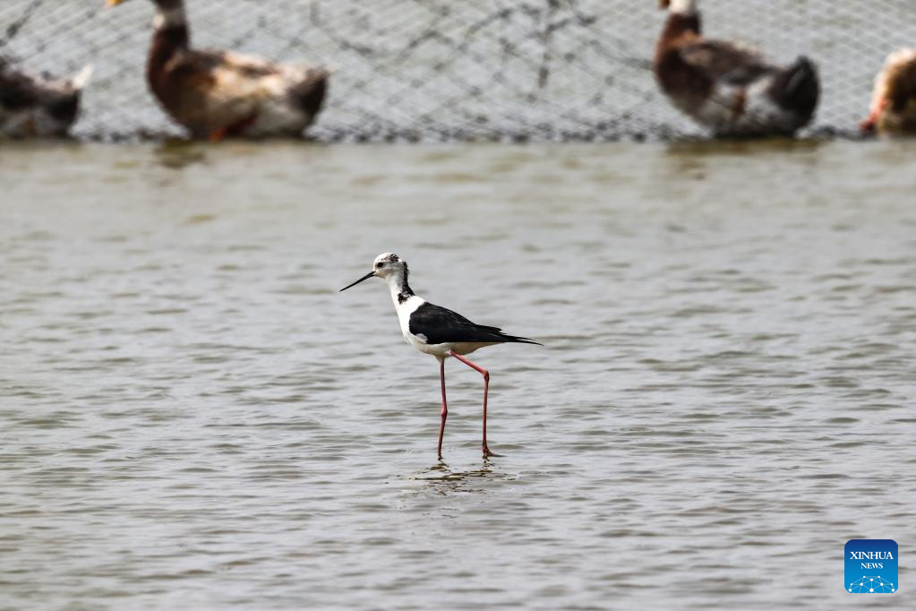 Photo taken on April 27, 2022 shows a black-winged stilt (Himantopus himantopus) at Dongzhaigang National Nature Reserve, south China's Hainan Province. Dongzhaigang National Nature Reserve, the first wetland nature reserve dominating mangrove forest in China, started to conduct bird diversity monitoring in order to learn the changes and rules of bird population here. (Xinhua/Zhang Liyun)