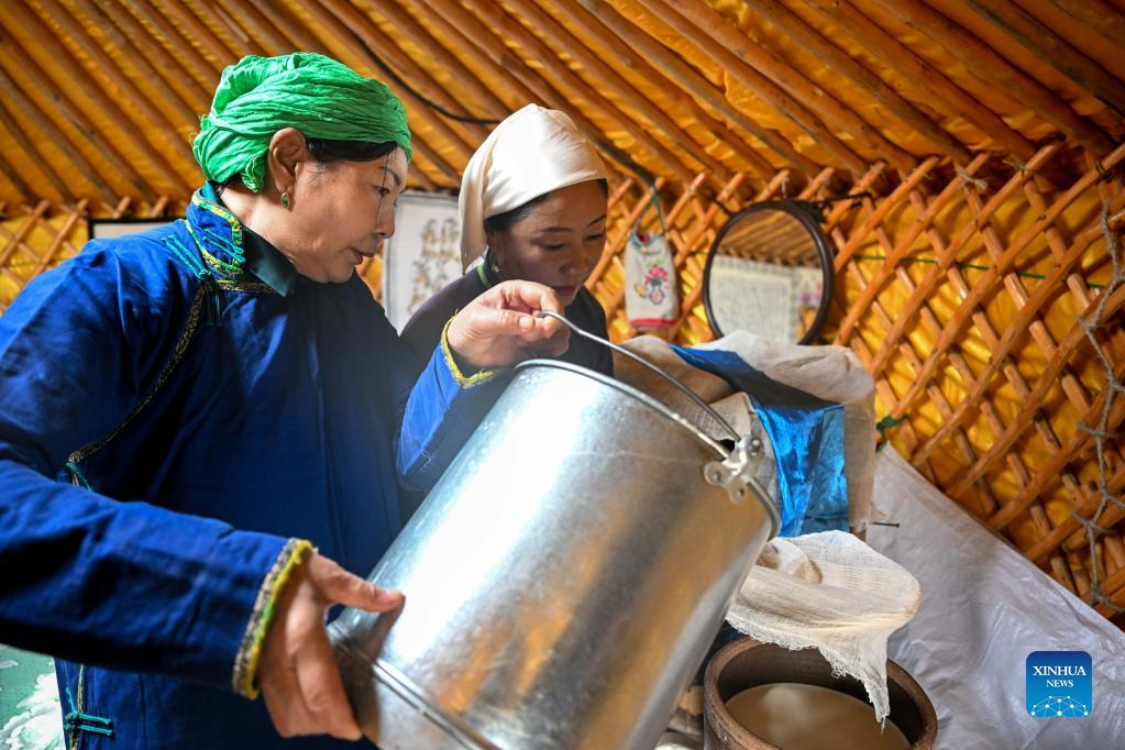 Tao Gao filters whey in Zhenglan Banner of Xilingol League, north China's Inner Mongolia Autonomous Region, April 27, 2022. Tao Gao is the national intangible inheritor of Chagaanyidee (dairy product) in Inner Mongolia. She combines modern techniques with traditional crafts and trains herders in pastoral areas to make dairy products. In recent years, the local government has boosted the development of traditional dairy food industry to increase the income of herdsmen. The average annual sales of dairy food in the whole banner reached about 60 million yuan (about 9 million U.S. dollars) in the past two years. (Xinhua/Lian Zhen)