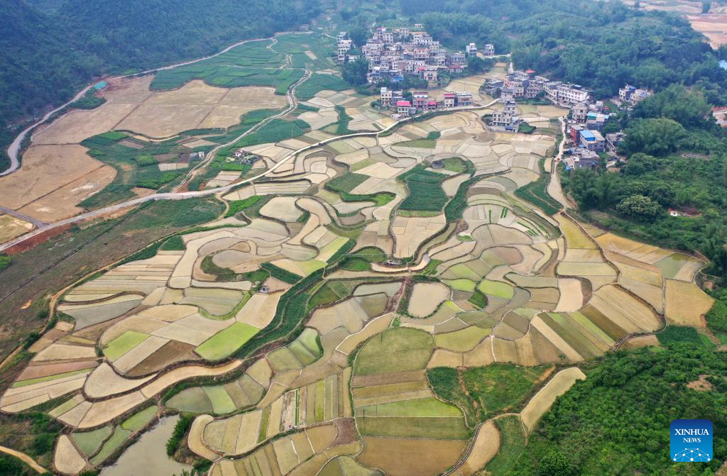 Aerial photo taken on May 6, 2022 shows paddy fields in Donglan County of south China's Guangxi Zhuang Autonomous Region. (Xinhua/Lu Boan)