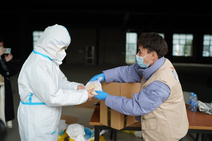 Miradil Mamtawla (R) distributes food to a medical worker in Nanchang, east China's Jiangxi Province, March 21, 2022. (Xinhua/Zhou Mi)
