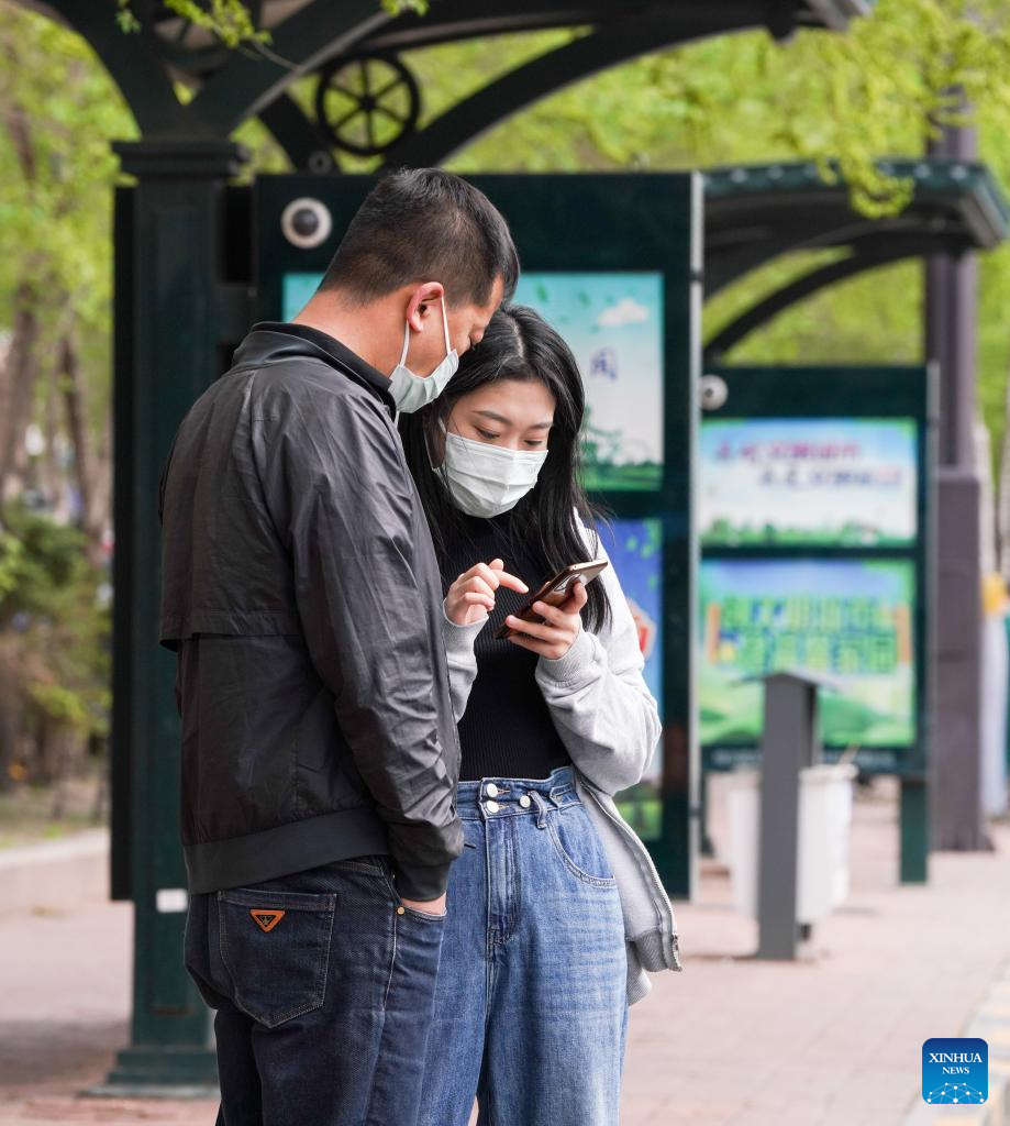 Citizens stand at a bus stop in Harbin, northeast China's Heilongjiang Province, May 11, 2022. Harbin started to resume normal life and production in an orderly manner from Wednesday. (Xinhua/Wang Song)