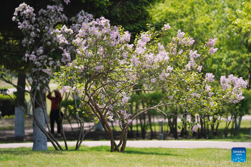 A citizen enjoys the view of flowers at a park in Harbin, northeast China's Heilongjiang Province, May 11, 2022. Harbin started to resume normal life and production in an orderly manner from Wednesday. (Xinhua/Zhang Tao)