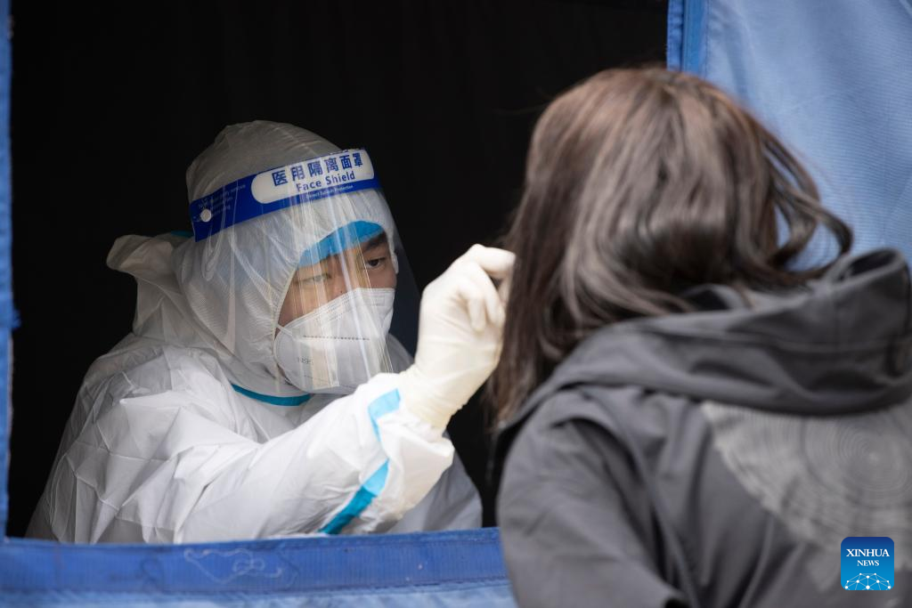 A medical worker collects swab sample for nucleic acid testing in Harbin, northeast China's Heilongjiang Province, May 11, 2022. Harbin started to resume normal life and production in an orderly manner from Wednesday. (Xinhua/Zhang Tao)