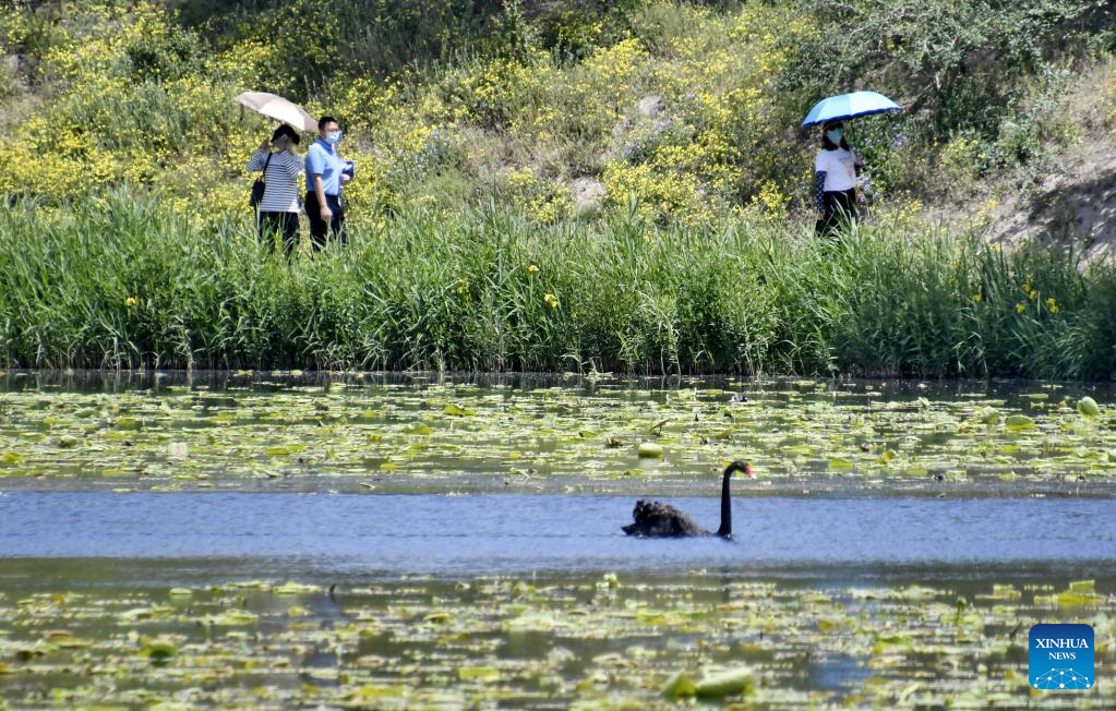 Tourists view a black swan in the lake in Yuanmingyuan Park in Beijing, capital of China, May 15, 2022. (Xinhua/Li Xin)
