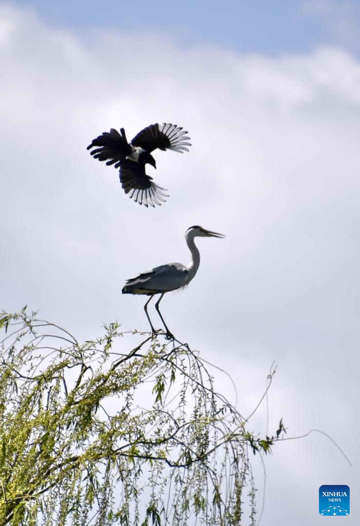 A magpie and a heron are seen in Yuanmingyuan Park in Beijing, capital of China, May 15, 2022. (Xinhua/Li Xin)