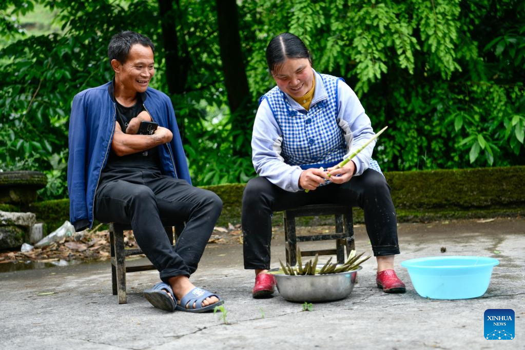 Jian Qin (R), accompanied by her husband Zhao Youliang, peels bamboo shoots in Zhongguan Township, Zheng'an County, southwest China's Guizhou Province, May 12, 2022. (Xinhua/Yang Wenbin)