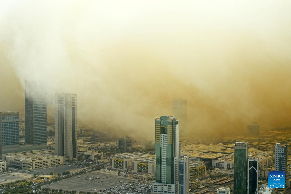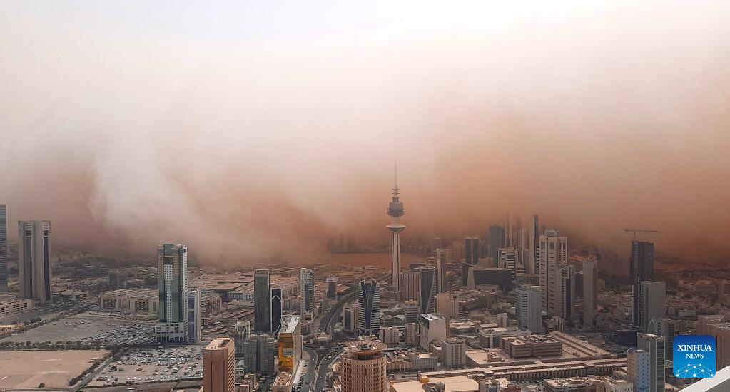 Photo taken on May 23, 2022 shows buildings shrouded in strong dust storm in Kuwait City, Kuwait. (Xinhua)