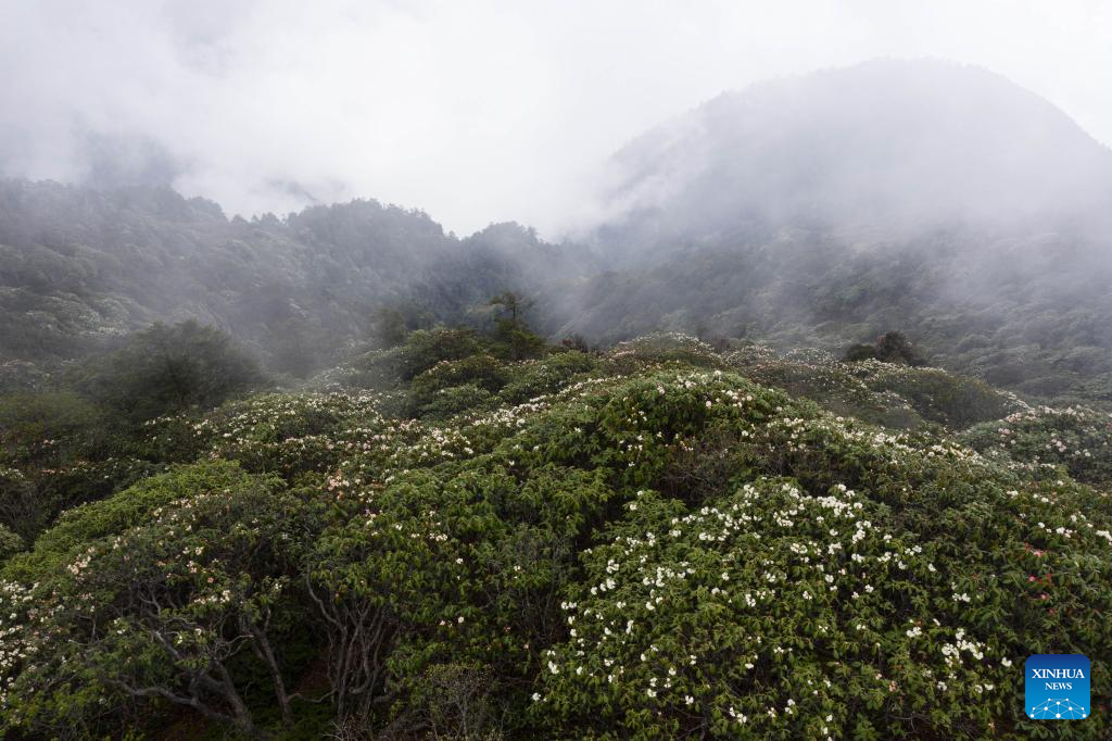 Aerial photo taken on June 5, 2022 shows blossoms of alpine azalea at Giant Panda National Park in Longmen Mountains in southwest China's Sichuan Province. (Xinhua/Jiang Hongjing)