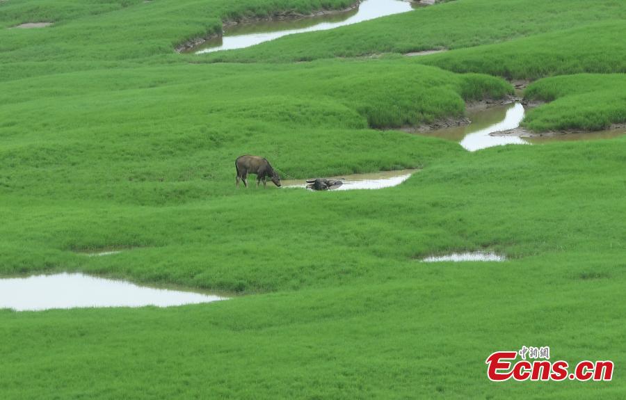 Cattle graze in the grass covered fluctuation zone of the Three Gorges Reservoir area in Fuling county, Chongqing, June 13, 2022. (Photo: China News Service/Chen Chao)
