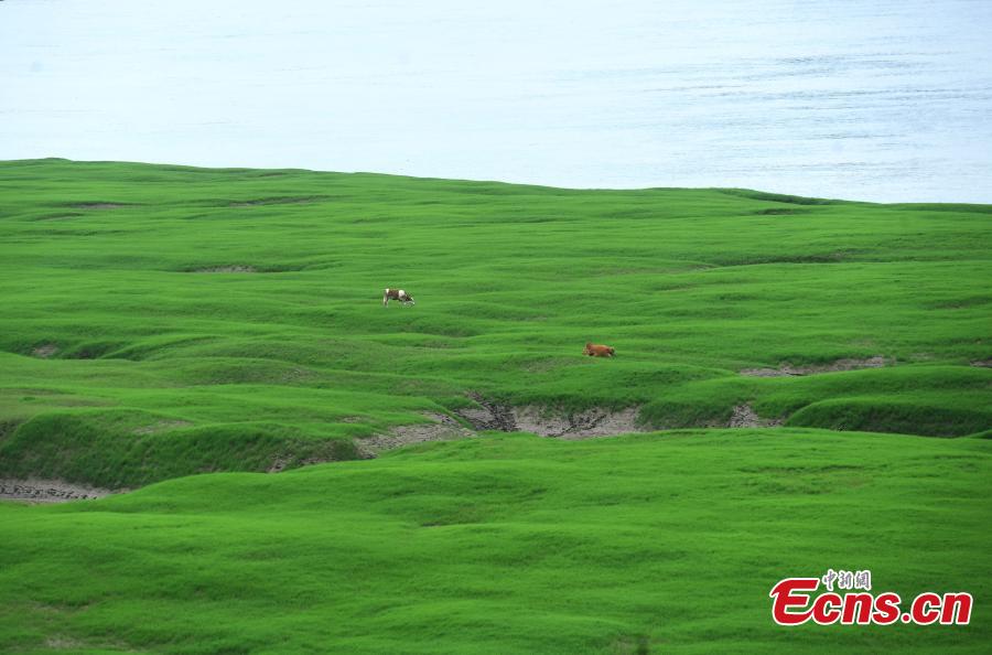Scene of grass stretches in the water-level fluctuation zone of the Three Gorges Reservoir area in Fuling county, Chongqing, June 13, 2022. (Photo: China News Service/Chen Chao)