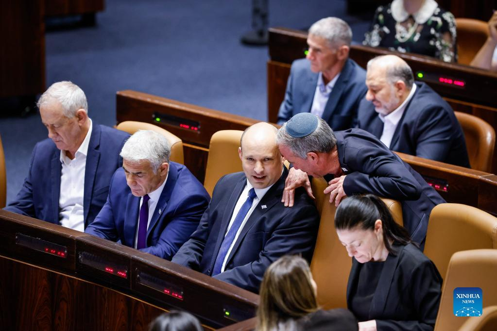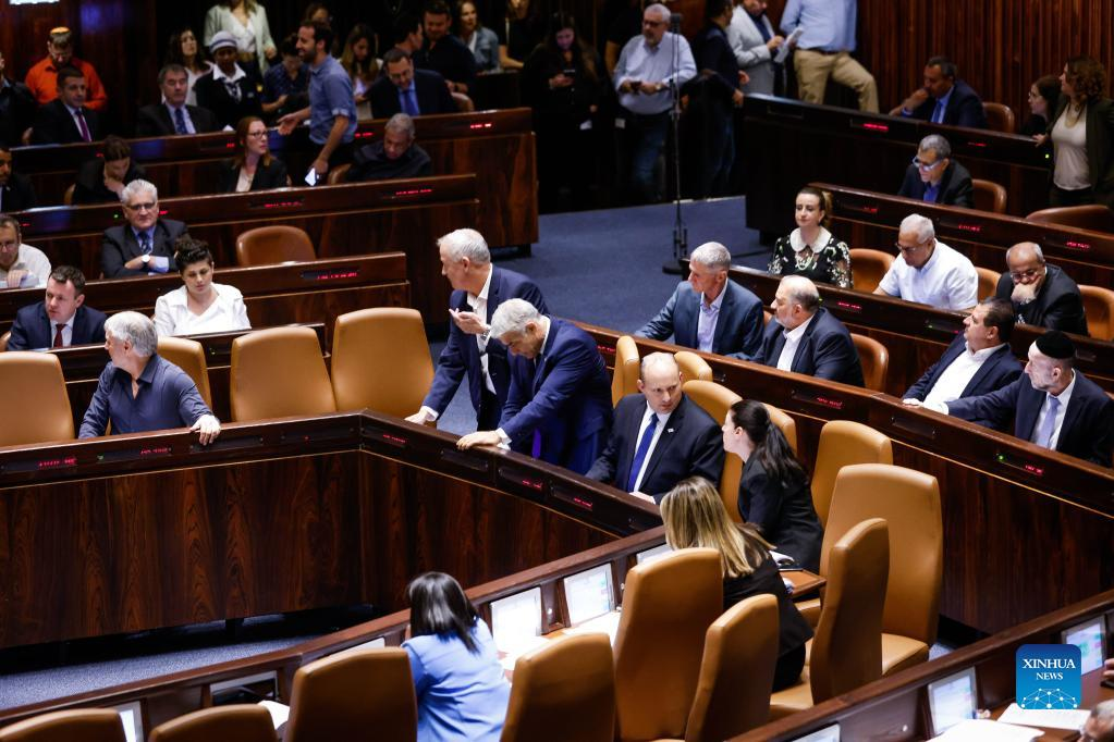 A vote on a bill to dissolve the parliament is held at the assembly hall of the Knesset in Jerusalem, June 22, 2022. Israeli lawmakers voted in favor of a bill to dissolve parliament in a preliminary vote on Wednesday, taking the first step in sending the country for its fifth elections in three years. (JINI via Xinhua)