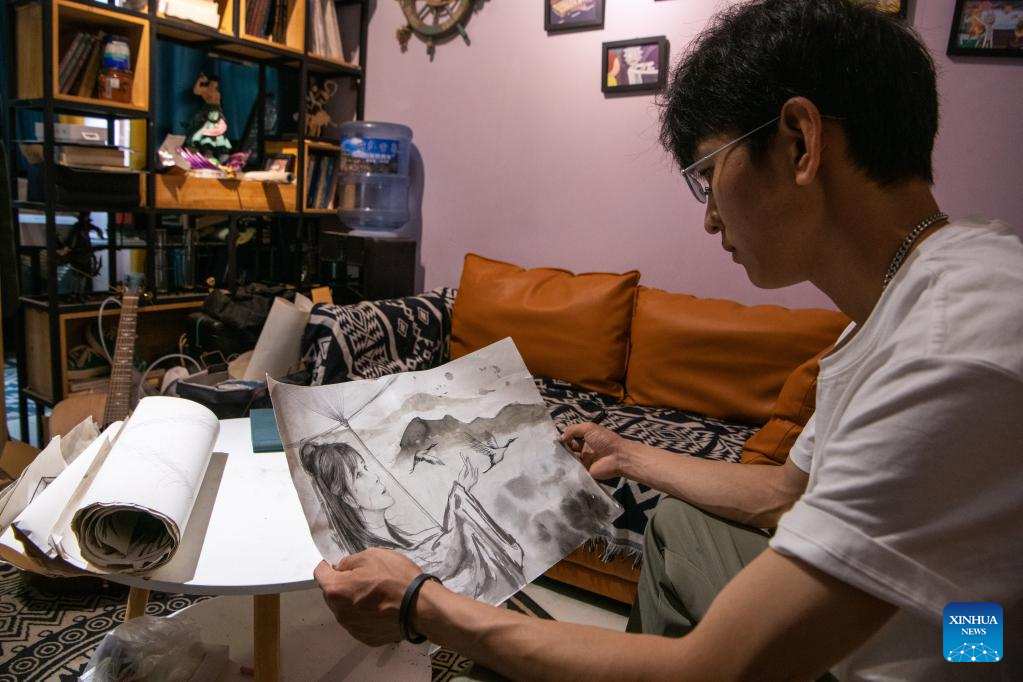 Liu Zhicheng draws up the draft of a wall painting at home in Yongsheng County, Lijiang City, southwest China's Yunnan Province, June 25, 2022.