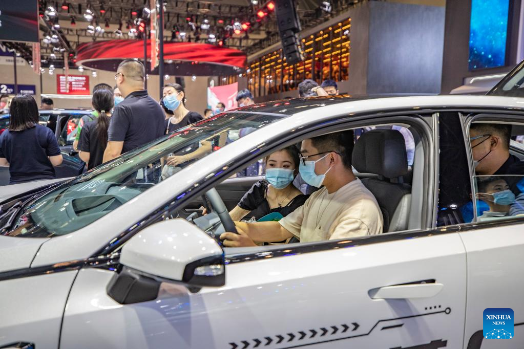 Visitors view a new energy vehicle during the 2022 Chongqing International Auto Exhibition in southwest China's Chongqing Municipality, June 25, 2022.