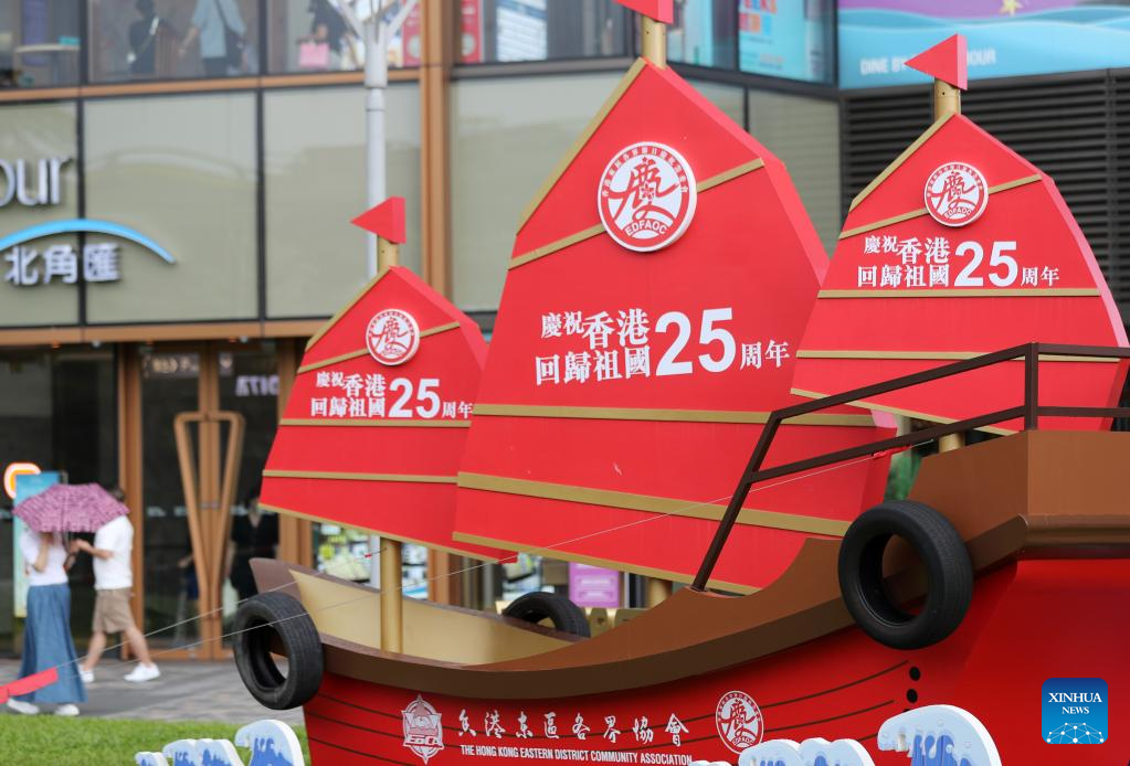 Photo taken on June 30, 2022 shows a barque-shaped installation marking the 25th anniversary of Hong Kong's return to the motherland in Hong Kong, south China. July 1 is the celebration day for the 25th anniversary of Hong Kong's return to the motherland. (Xinhua/Li Gang)