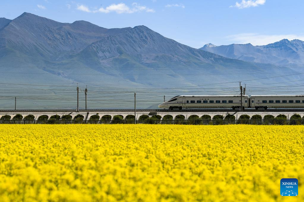 A train passes by cole flower fields in Menyuan Hui Autonomous County of Haibei Tibetan Autonomous Prefecture, northwest China's Qinghai Province, July 3, 2022. (Xinhua/Zhang Long)