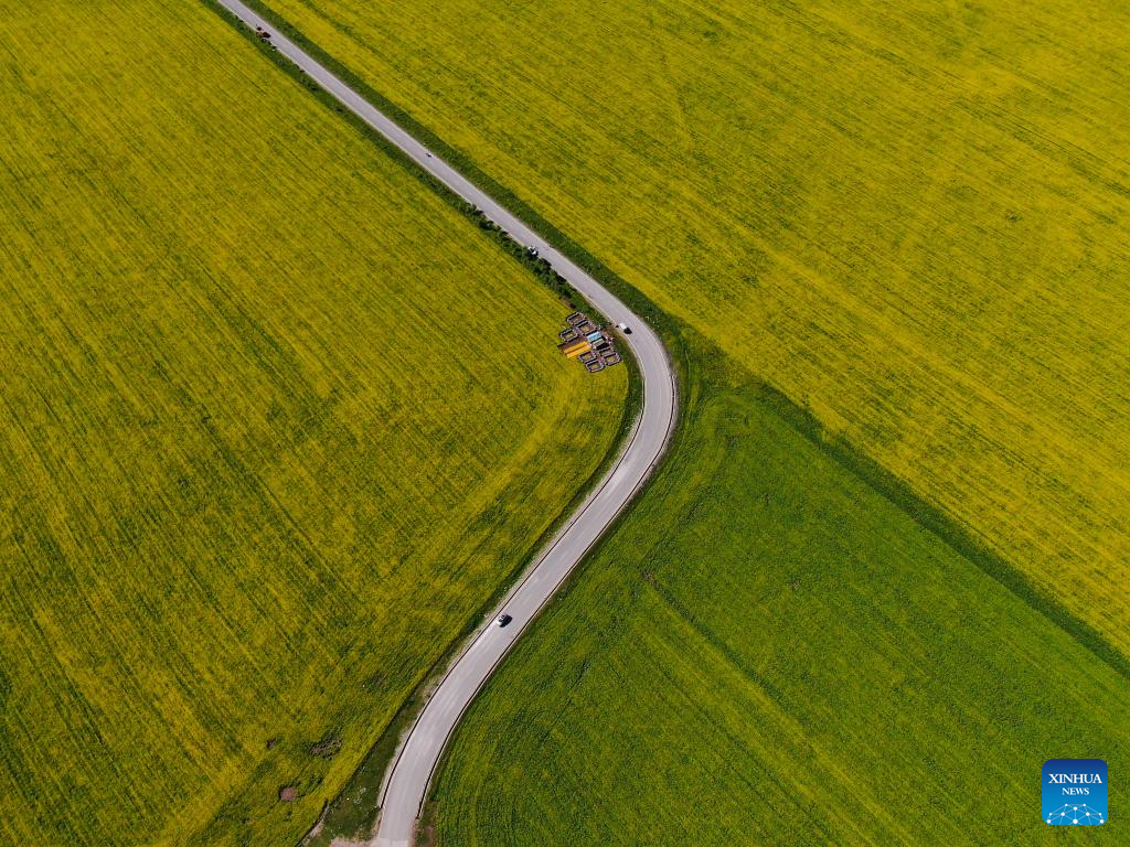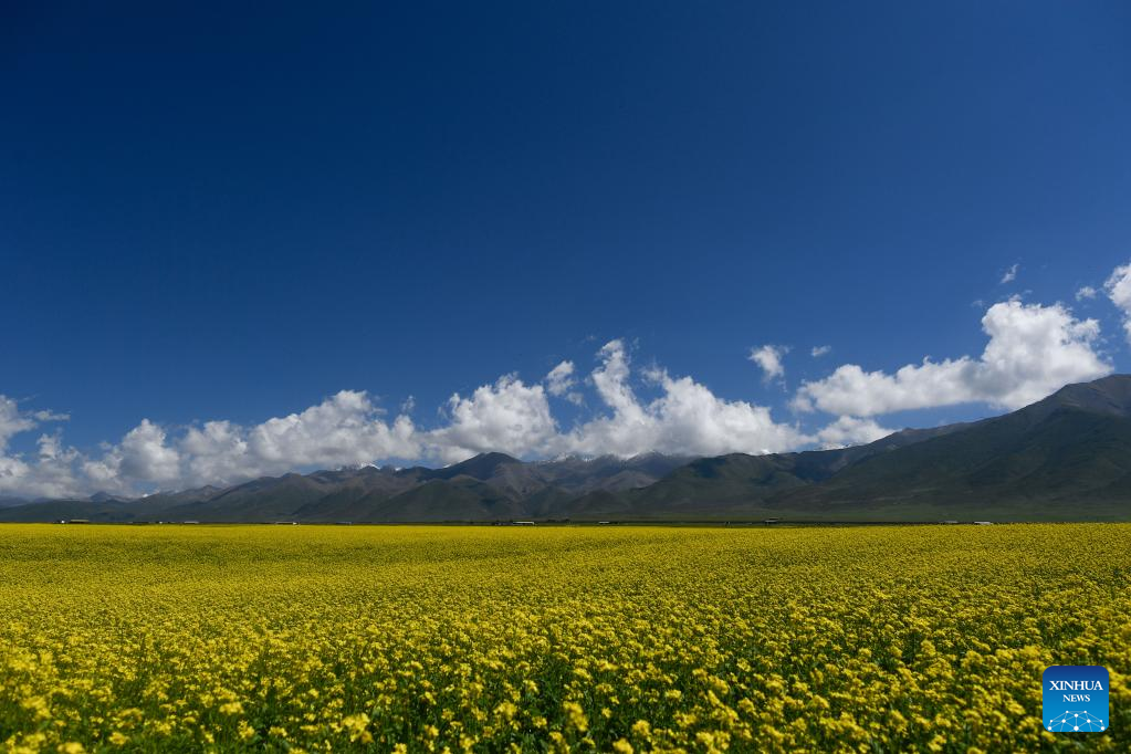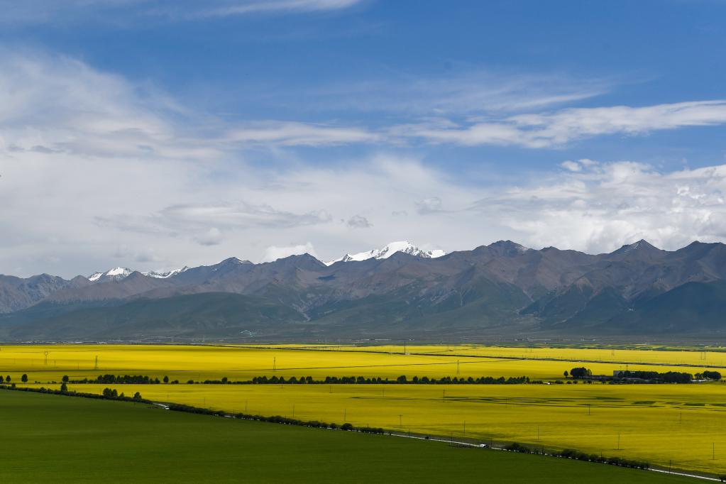 Photo taken on July 3, 2022 shows cole flower fields in Menyuan Hui Autonomous County of Haibei Tibetan Autonomous Prefecture, northwest China's Qinghai Province. (Xinhua/Zhang Long)