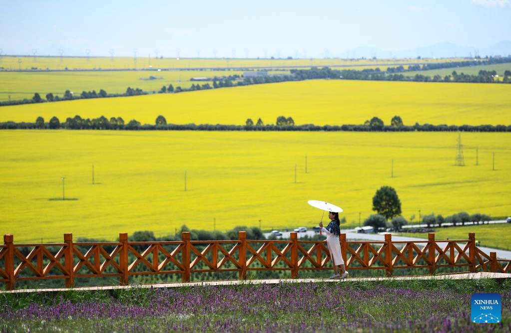A visitor is seen among cole flower fields at a scenic spot in Menyuan Hui Autonomous County of Haibei Tibetan Autonomous Prefecture, northwest China's Qinghai Province, July 3, 2022. (Xinhua/Zhang Long)