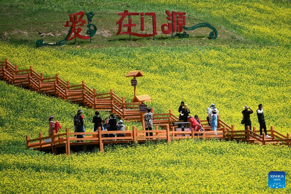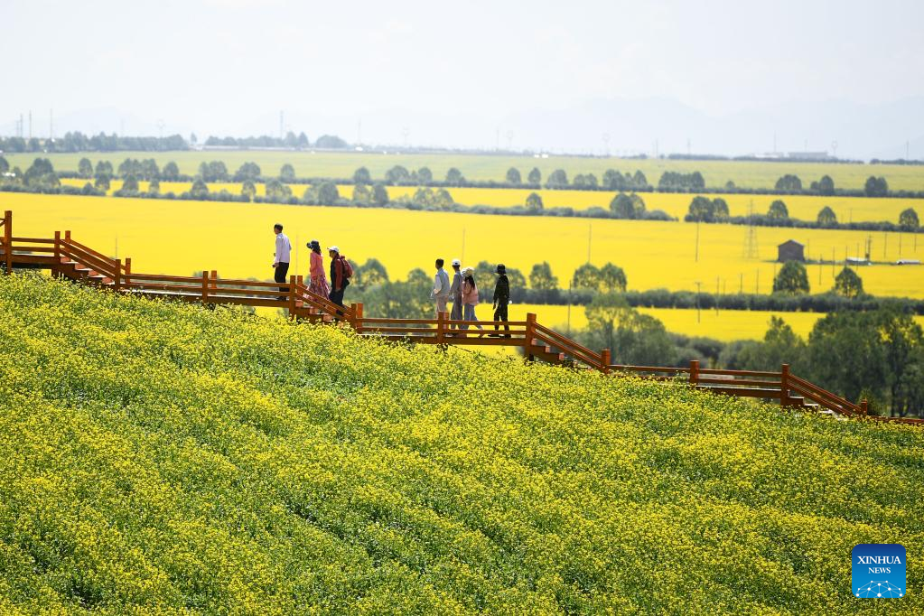 Visitors are seen among cole flower fields at a scenic spot in Menyuan Hui Autonomous County of Haibei Tibetan Autonomous Prefecture, northwest China's Qinghai Province, July 3, 2022. (Xinhua/Zhang Long)
