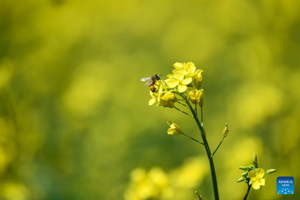 A bee gathers nectar among cole flowers in Menyuan Hui Autonomous County of Haibei Tibetan Autonomous Prefecture, northwest China's Qinghai Province, July 2, 2022. (Xinhua/Zhang Long)