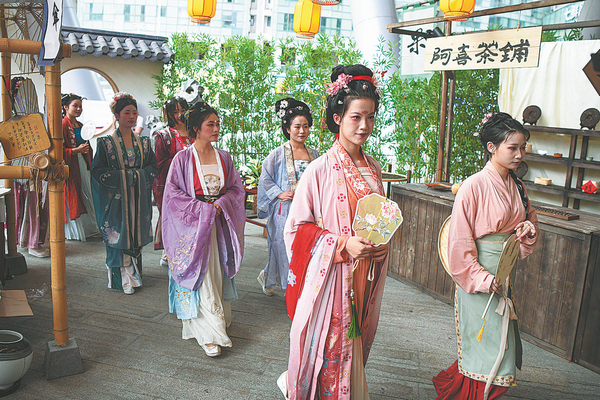 Workers at a temporary market in Changsha, Hunan province, featuring Song Dynasty lifestyles attract visitors by parading in ancient dress. YANG HUAFENG/CHINA NEWS SERVICE