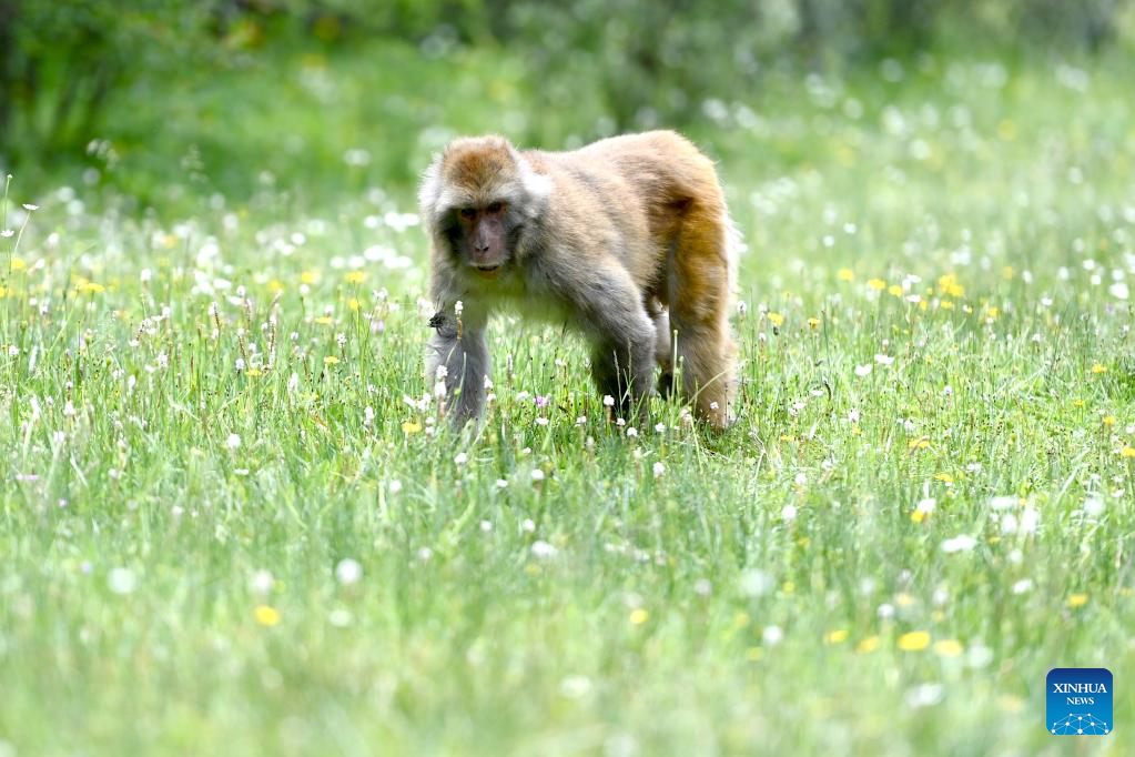 Photo taken on July 11, 2022 shows a Tibetan macaque in a forest farm in Baizha Township of Nangqian County, Yushu Tibetan Autonomous Prefecture, northwest China's Qinghai Province. (Xinhua/Liu Zexing)