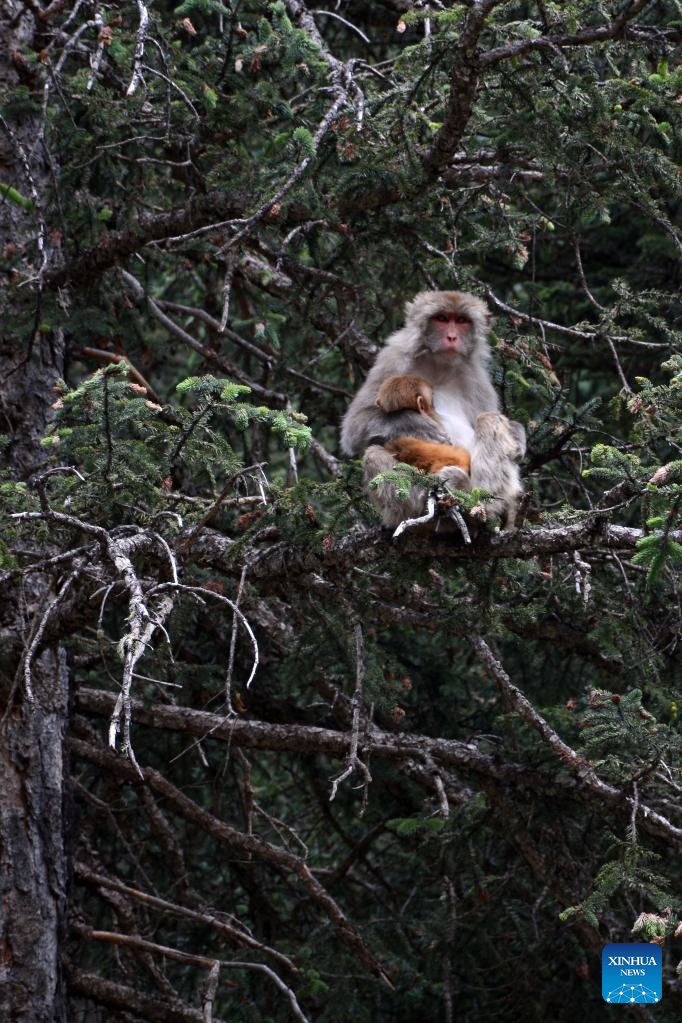 Photo taken on July 11, 2022 shows Tibetan macaques in a forest farm in Baizha Township of Nangqian County, Yushu Tibetan Autonomous Prefecture, northwest China's Qinghai Province. (Xinhua/Liu Zexing)