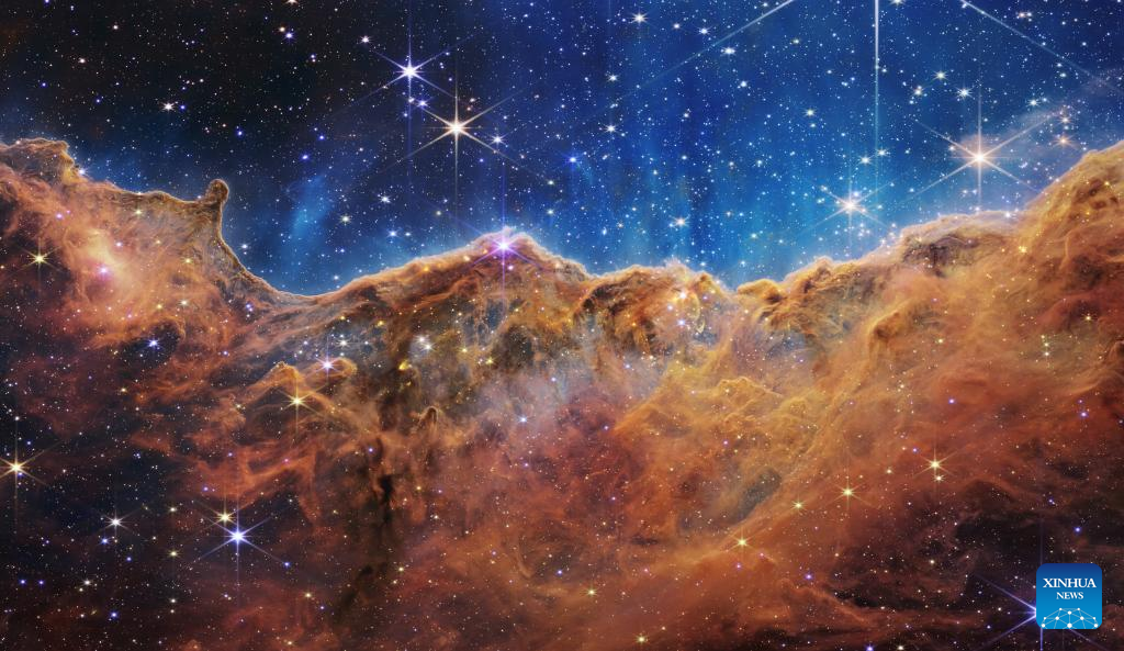 Image released by NASA on July 12, 2022 shows a composite image of the Cosmic Cliffs in the Carina Nebula, created with James Webb Space Telescope's NIRCam and MIRI. NASA released James Webb Space Telescope's first full-color images of the universe and their spectroscopic data on Tuesday, revealing the unprecedented and detailed views of the universe. (NASA, ESA, CSA, STScI/Handout via Xinhua)