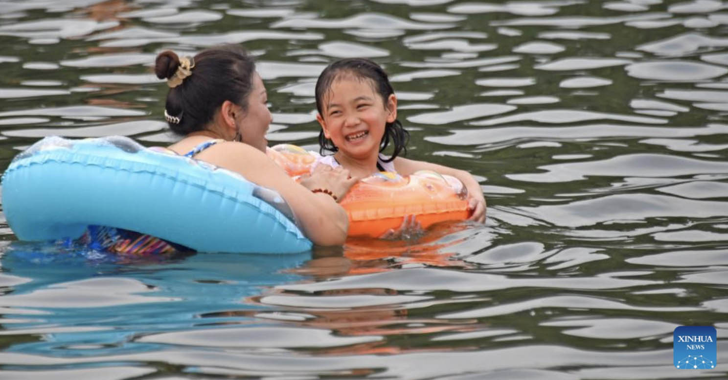 Photo taken on July 16, 2022 shows people playing in water in Xianju County of Taizhou City, east China's Zhejiang Province. (Xinhua/Wang Huabin)