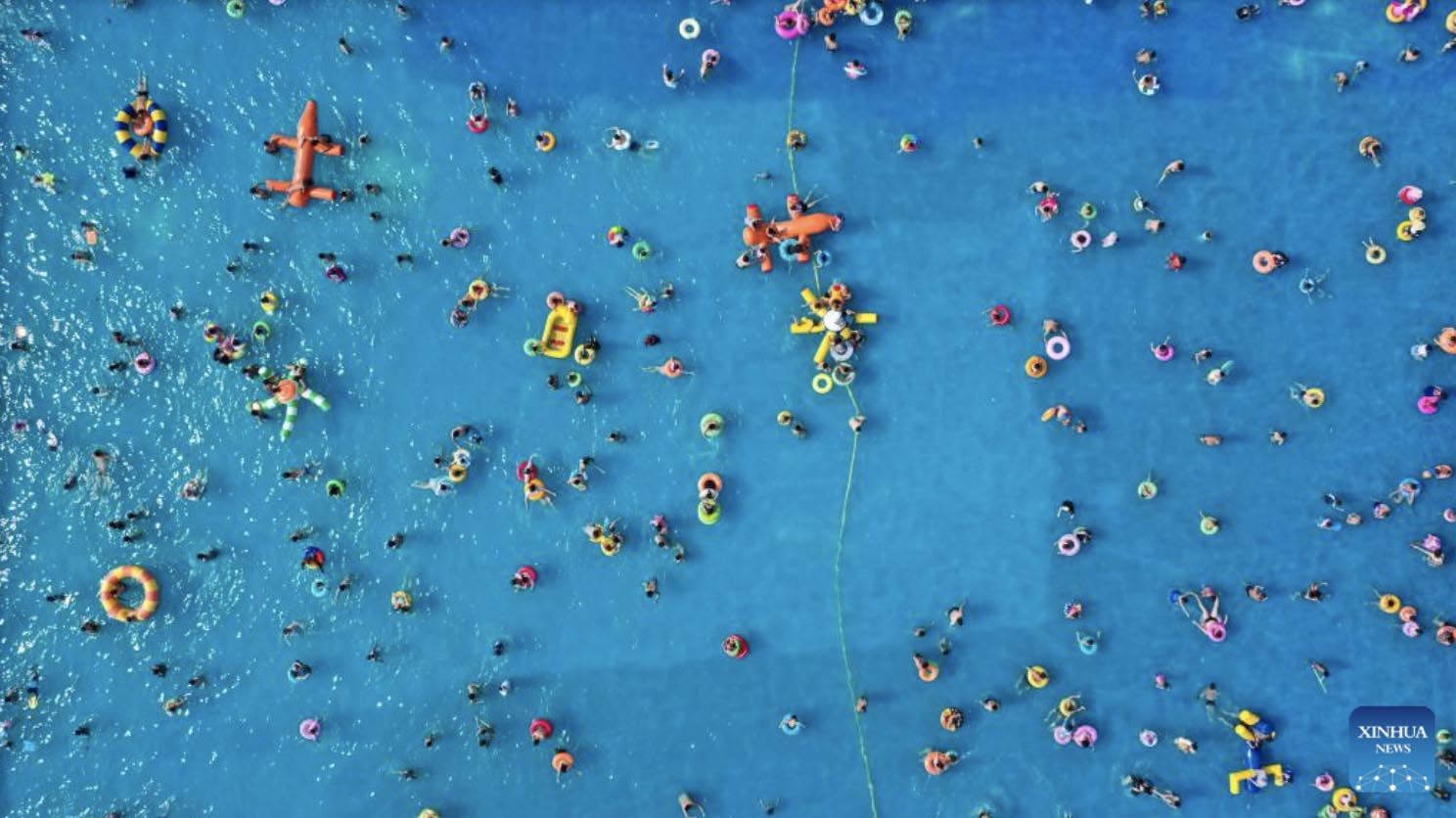 Aerial photo taken on July 16, 2022 shows people playing at a water park in Zunhua City, north China's Hebei Province. (Xinhua/Liu Mancang)