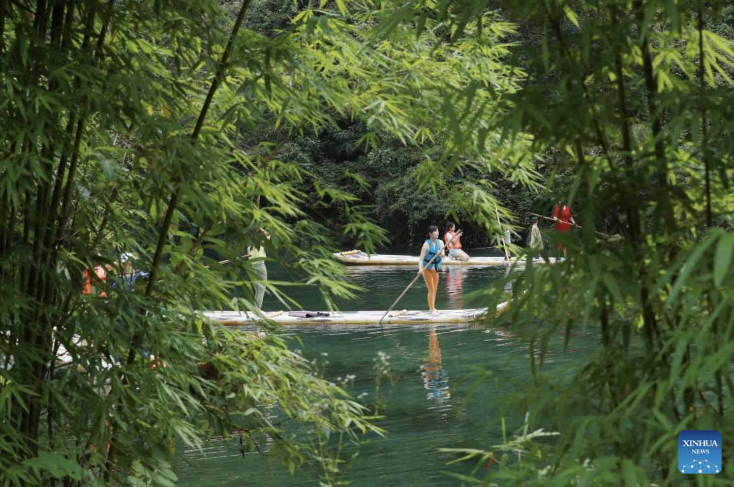 Photo taken on July 16, 2022 shows visitors experiencing bamboo rafting at Sanxia Bamboo Scenic Resort in Zigui County of Yichang City, central China's Hubei Province. (Xinhua/Wang Gang)
