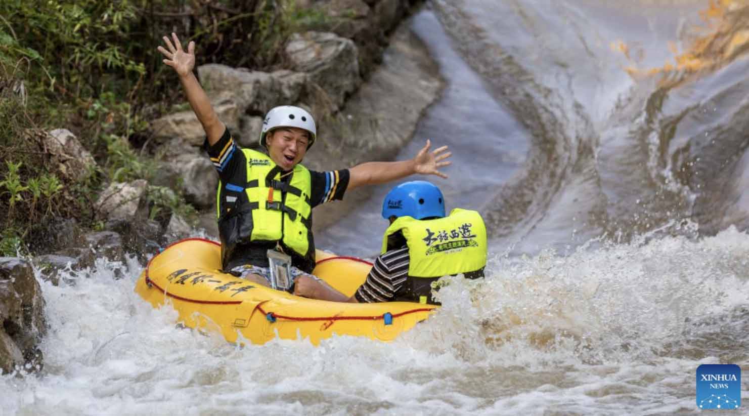 Photo taken on July 16, 2022 shows visitors rafting in Zhongjian Township of Qianxi City, southwest China's Guizhou Province. (Xinhua/Fan Hui)