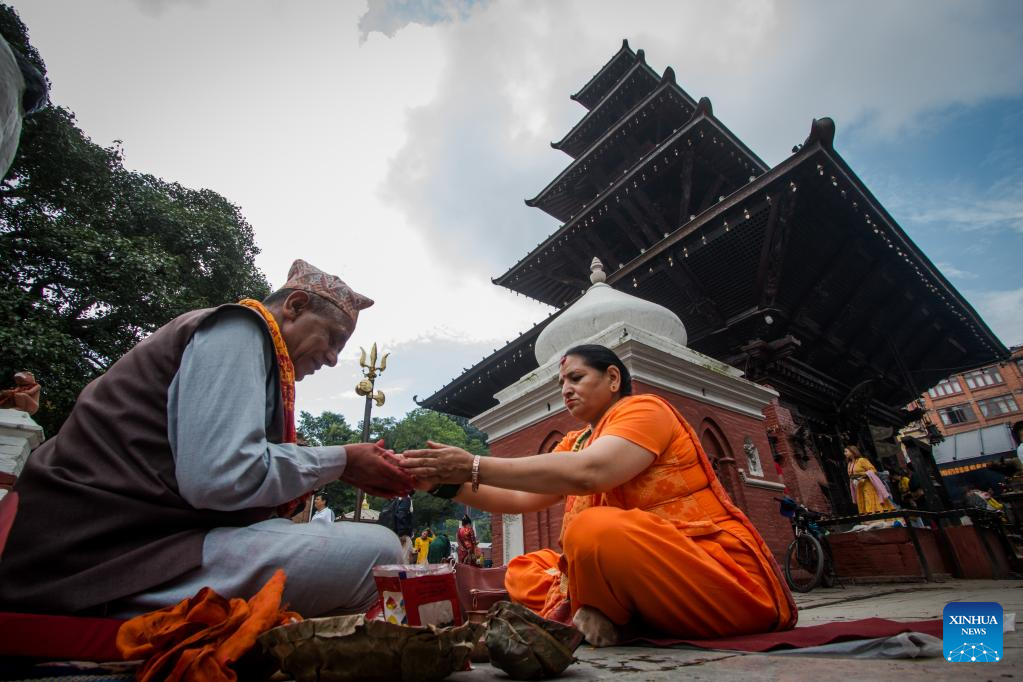 A devotee presents offerings to a priest during the first Monday of the holy month of Shrawan in Lalitpur, Nepal, July 18, 2022. The holy month of Shrawan is considered auspicious by Hindus for praying to Lord Shiva for happiness and prosperity. (Photo by Hari Maharjan/Xinhua)