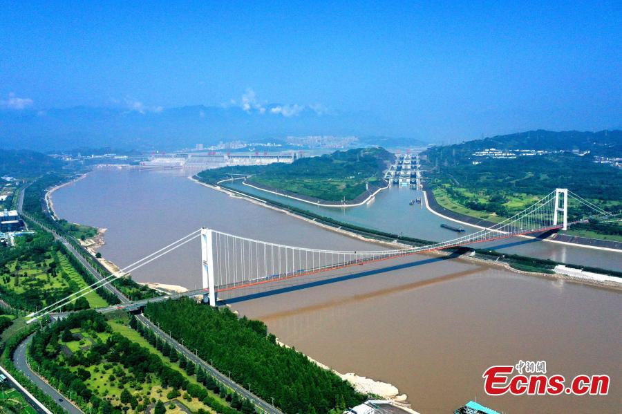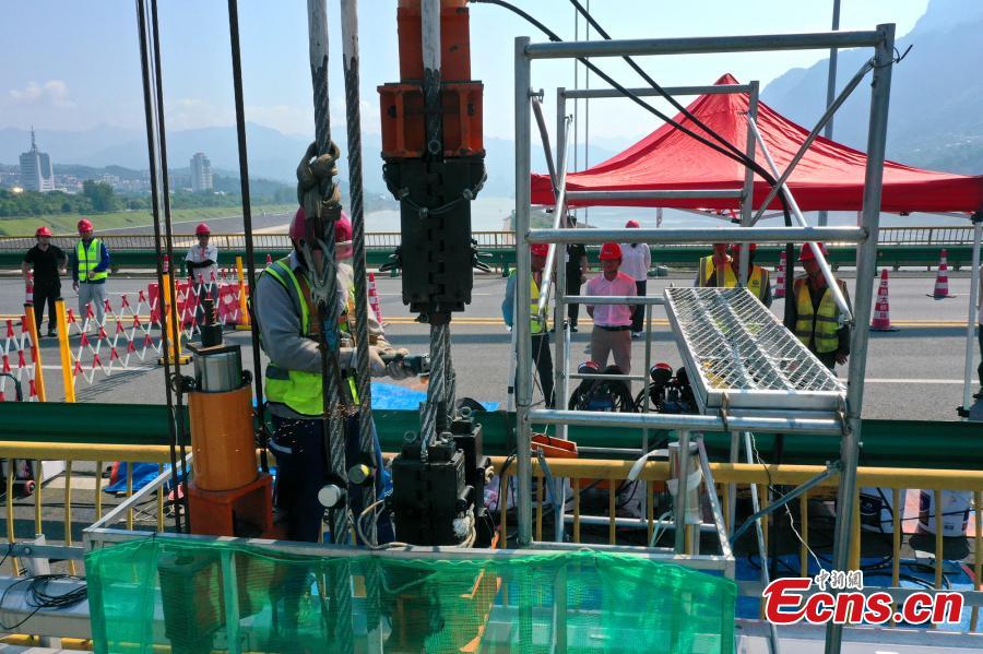 Replacement work of 280 cables on Xiling Yangtze River bridge is underway in Yichang, central China's Hubei Province, July 19, 2022. (Photo: China News Service/Tang Wei)