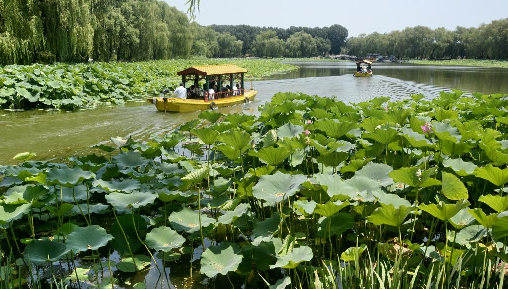 People look at lotus flowers at Yuanmingyuan Park in Beijing, capital of China, July 20, 2022. (Xinhua/Li Xin)